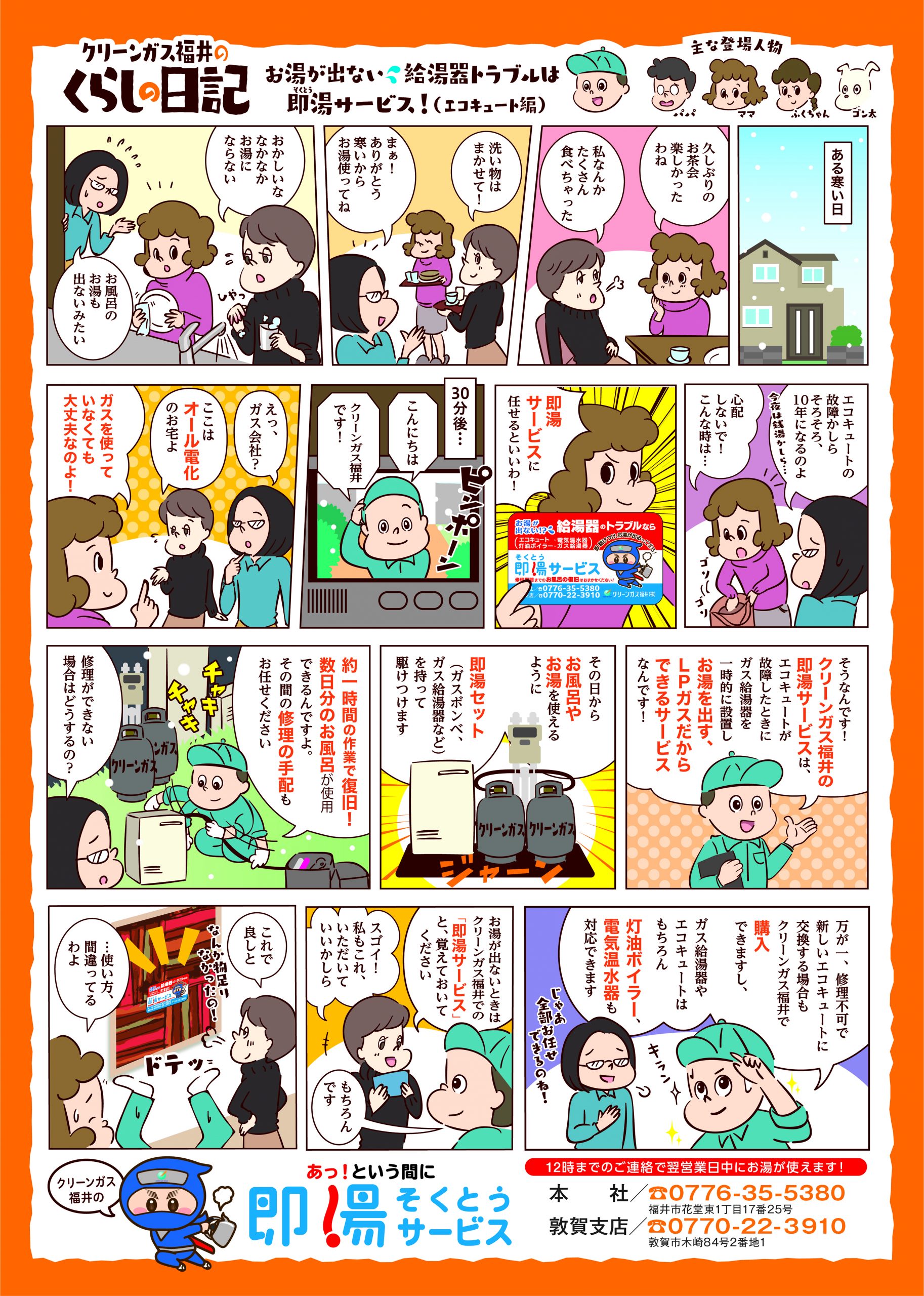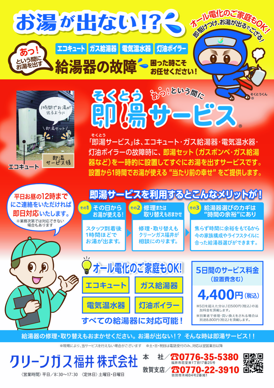 「即湯(そくとう)サービス」は、エコキュート・ガス給湯器・電気温水器・灯油ボイラーの故障時に、即湯セット(ガスボンベ・ガス給湯器など)を一時的に設置してすぐにお湯を出すサービスです。 設置から1時間でお湯が使える“当たり前の幸せ”をご提供します。