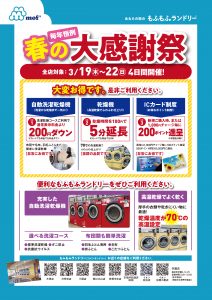 又、大変好評な乾燥機の100円で5分間延長サービスも引き続き実施します。